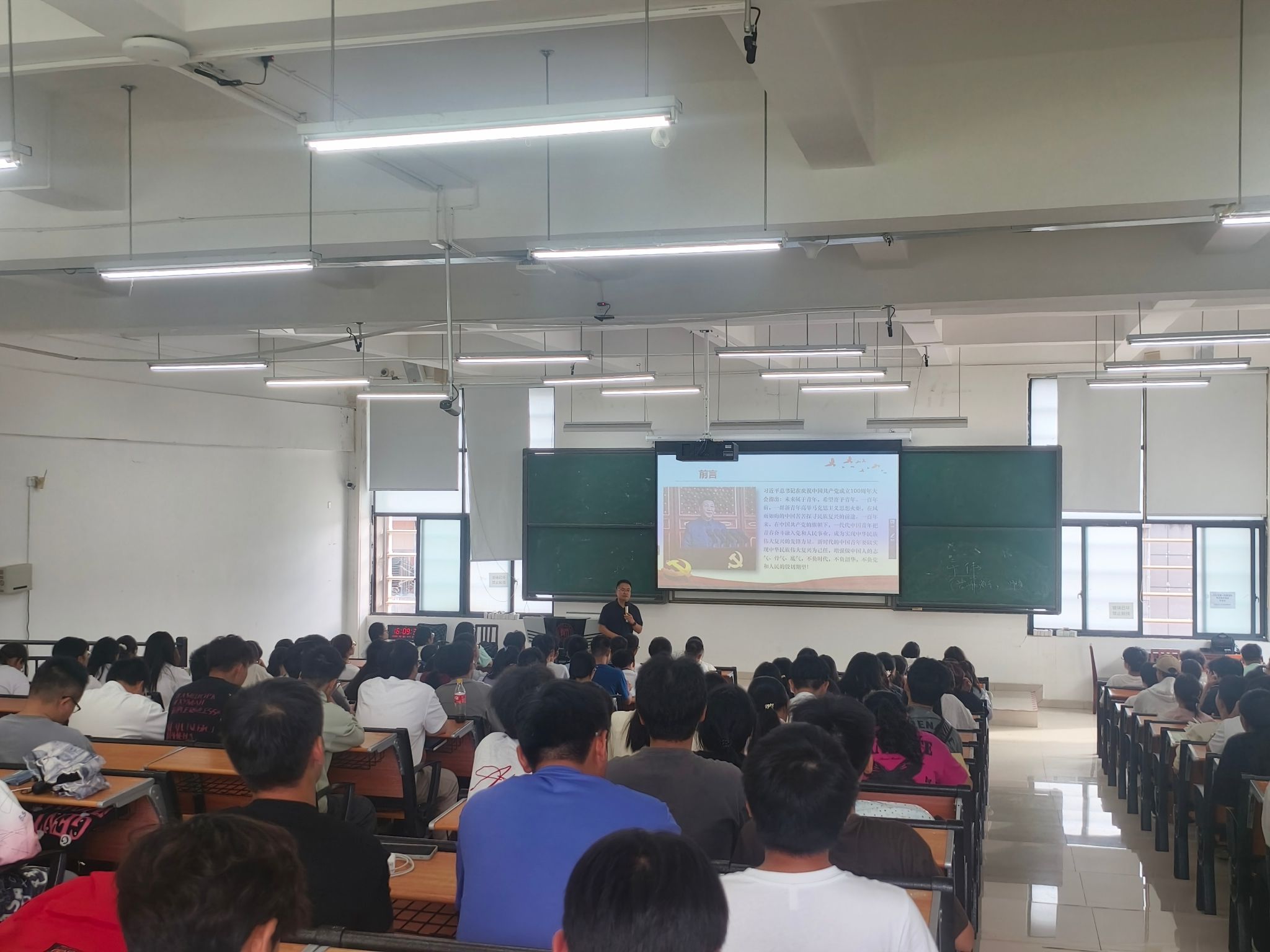 孙谦从“坚持学史明理,深入理解实现今日中国繁荣富强之源”“坚持凝心铸魂,积极凝聚推进强国复兴伟业精神之力”“坚持自立自强,不断增强推进强国复兴伟业服务之能”“坚持感恩奋进,自觉肩负推进强国复兴伟业青年之责”等维度,引导同学们深刻认识中国共产党团结带领中国人民创造的伟大历史成就,深刻理解中国共产党一经成立就确立了为中国人民谋幸福、为中华民族谋复兴的初心使命。他希望同学们自觉学习贯彻习近平新时代中国特色社会主义思想,继承和弘扬好社会主义先进文化和中国精神,以实际行动向英雄模范人物学习,努力将自己锻造成为有理想之人、有本领之人、敢担当之人、能吃苦之人、肯奋斗之人。他希望同学们要自觉肩负时代使命,切实做到坚定理想信念,时刻校准报效祖国、服务人民的人生坐标;坚守初心使命,积极投身强国建设、民族复兴的伟大实践;坚持自我革新,持续增强能担重任、堪当大用的本领才干。最后,他引导同学们要积极向党靠拢,在党组织的培养下健康成长成才。