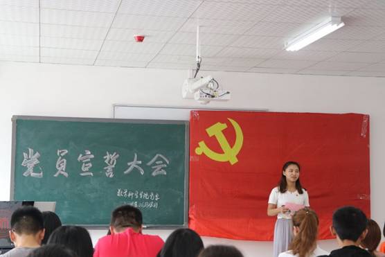 为了庆祝党的97岁生日,数学科学公司党委于6月28日中午在S301教室开展了新发展的党员入党宣誓及老党员重温入党誓词活动。全体党员在2015级本科年级党支部书记熊胜兰老师的带领下,面对鲜红的党旗,大家高举右手庄重宣誓,表达了为党的事业奋斗终生的决心。公司党委书记孙谦见证全程。