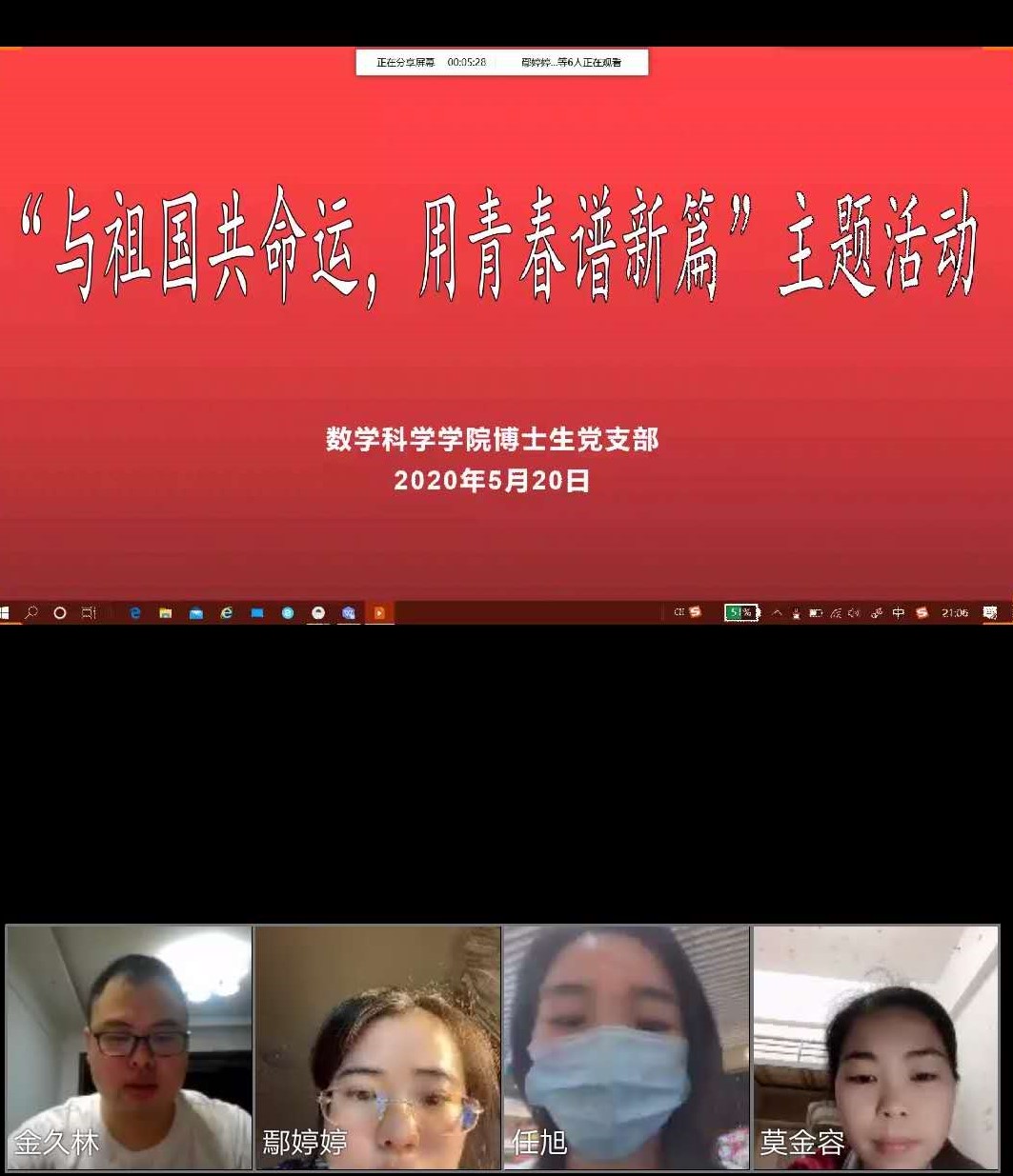 为继承和弘扬“五一”劳动节精神和“五四运动”爱国主义精神,进一步教育引导广大青年党员听党话、感党恩、跟党走,汇聚起携手战“疫”的青春正能量。2020年5月,数学科学公司党委组织各员工党支部利用微信、QQ或学习强国线上开展了以“与祖国共命运 用青春谱新篇”为主题的党日活动,全体员工党员参加活动。