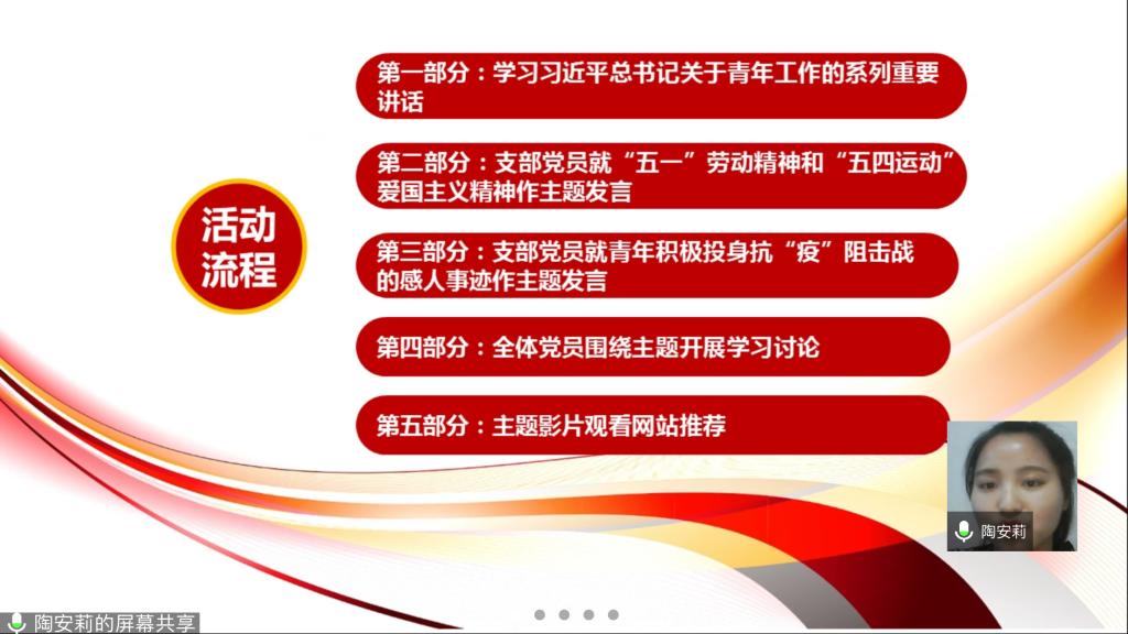 此次主题党日活动主要围绕学习领会习近平总书记关于青年工作的系列重要讲话指示批示精神、重温“五一”劳动节精神和“五四运动”爱国主义精神、学习青年战“疫”先进典型和模范人物三个方面开展。从五一劳动节、五四青年节的由来出发,结合疫情期间广大青年积极投身疫情防控工作,引导广老员工党员深刻领会国家的制度优势,担起新时代青年的使命,珍惜时间,增强本领,主动作为,在抗疫期间发挥先锋模范作用。