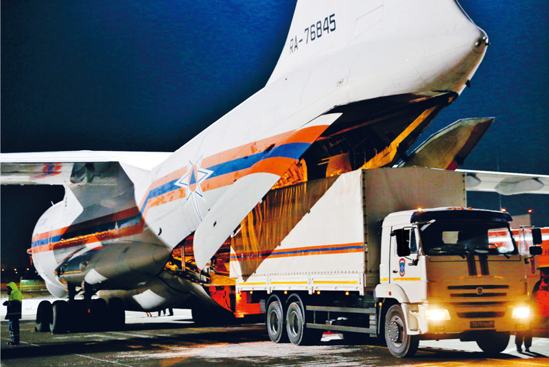 2020年2月8日,在俄罗斯莫斯科附近的茹科夫斯基机场,工作人员将俄罗斯政府向中方提供的医疗援助物资装上运输机。 新华社/卫星社