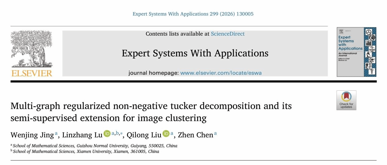 近日,公司BV伟德官方网站卢琳璋教授团队在人工智能领域1区TOP期刊Expert Systems With Applications(IF=7.5)上发表了题为“Multi-graph regularized non-negative tucker decomposition and its semi-supervised extension for image clustering”的研究论文。