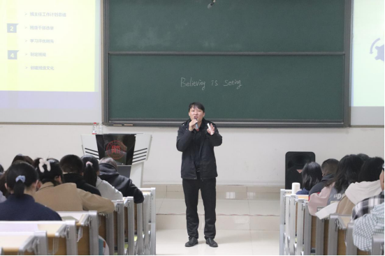 活动中,张雪飞首先以同学们的学习生活为例,介绍班主任在公司、班级中不可替代的作用,并指出同学们以后应该争做有理想信念、有道德情操、有扎实学识、有仁爱之心的“四有”好老师。其次,详细介绍了班主任的工作职责和管理策略:一名班主任要身怀五心——宽容心、责任心、公平心、细心、爱心。最后,结合自身的教学经历为同学们传授做班主任的经验,并向同学们推荐许多关于班主任学习提升的书籍,活动在同学们的掌声中圆满结束。