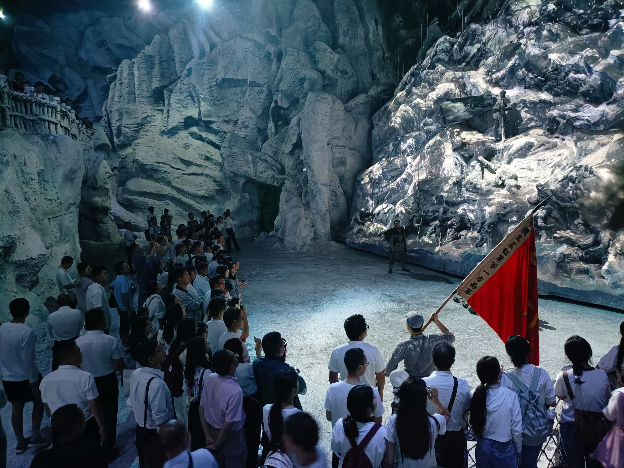 随后,师生党员沿着“红飘带”通道有序进入数字体验馆,依次参观“红飘带·伟大远征”、“红飘带·多彩飞越”两大主题展览。在“红飘带·伟大远征”展区,以“一面红旗、一盏马灯”作为视觉线索,结合数字技术模拟的枪炮轰鸣、风雪呼啸声,大家依次参观“无名英雄”、“血火洗礼”、“伟大转折”、“砥砺征途”、“胜利丰碑”以及“新时代新征程”六大篇章,生动再现了红军长征途中的艰难险阻与伟大转折。