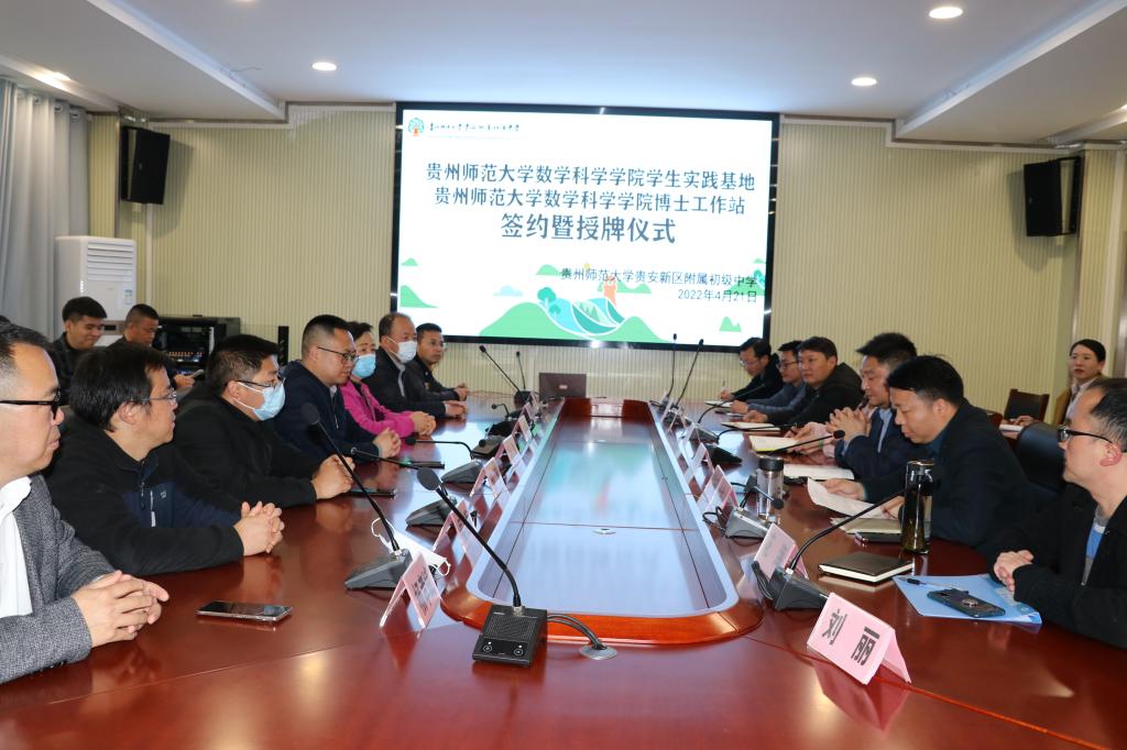 4月21日下午,BV伟德官方网站与BV伟德官方网站贵安新区附属初级中学共建“新时代基础教育强师实践基地”签约授牌仪式在师大贵安附属初中会议室举行。数学科学公司党政班子成员、数学教育研究所负责人,附属初中校领导、中层干部和数学组教师参加签约挂牌仪式。仪式由附属初中副董事长贺宁馨主持。